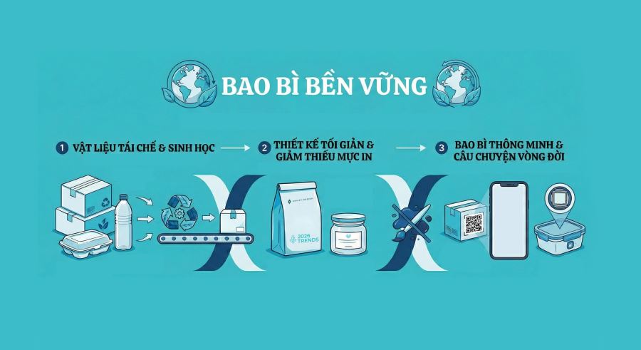 Bao bì bền vững (Sustainable Packaging): Thiết kế bao bì không chỉ cần đẹp mà phải thể hiện rõ cam kết môi trường. Sử dụng vật liệu tái chế, thiết kế giảm thiểu mực in, hoặc bao bì thông minh (có mã QR kể câu chuyện về vòng đời sản phẩm).