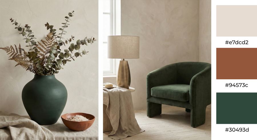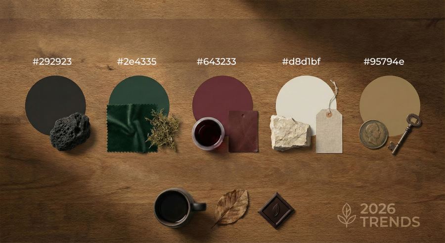 Deep Rich Tones: Các màu đậm như Silhouette (màu than/espresso sâu), đỏ rượu vang, hoặc xanh rêu đậm để tạo cảm giác vững chãi và cao cấp (premium).