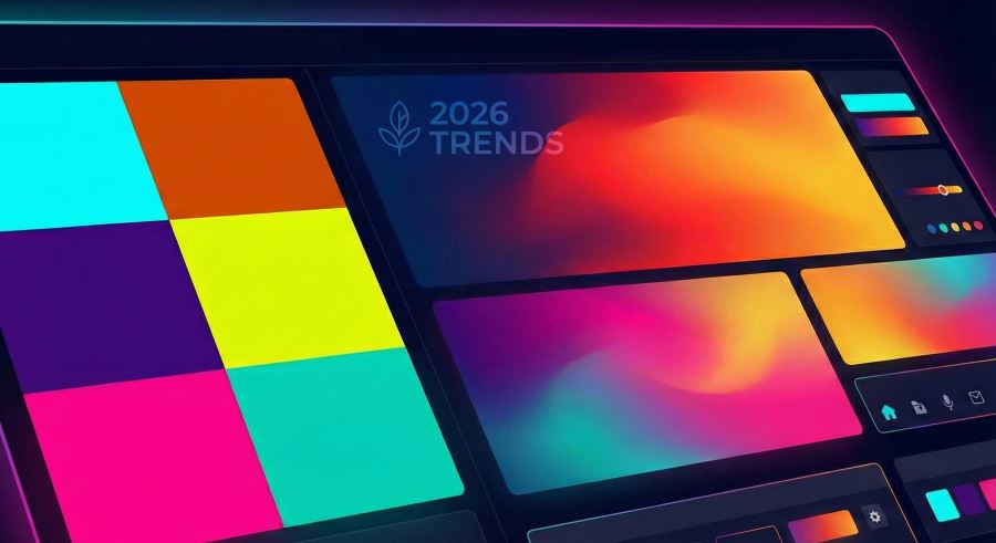 Hyper-Contrast & Gradients: Sử dụng các cặp màu đối lập mạnh (Color Blocking) hoặc gradient chuyển màu phức tạp, mượt mà để thu hút sự chú ý ngay lập tức trên môi trường kỹ thuật số (digital-first).